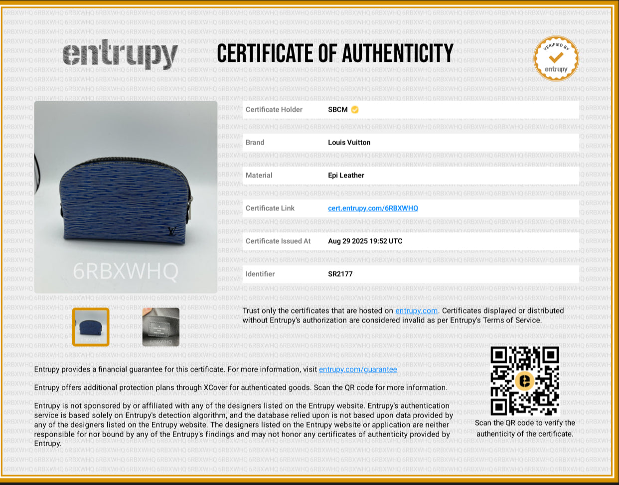 Handbags: Our handbags are guaranteed authentic. We authenticate using one of the most trusted tools in luxury resale, Entrupy. Entrupy has developed AI-powered authentication solutions for businesses, just like ours, allowing us to sell and you to shop with full confidence. Entrupy uses state-of-the-art authentication solutions, powered by machine learning and computer vision to authenticate. For more information on Entrupy works, visit their website www.entrupy.com.