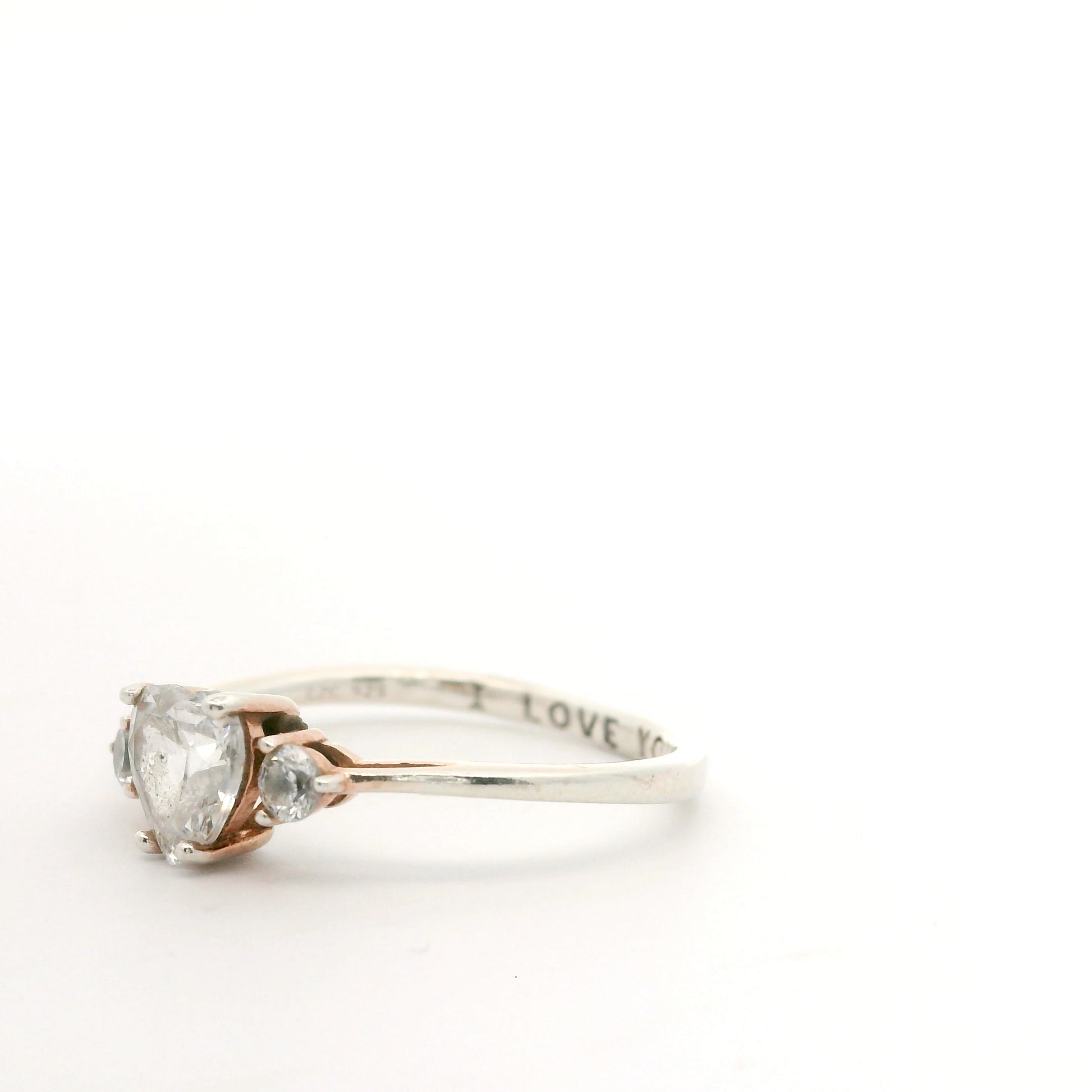 925 Silver (engraved "I LOVE YOU" on interior shank) | 1.5 Grams | Stones: 1 heart shaped clear stones, 2 accent clear stones | Size: 6